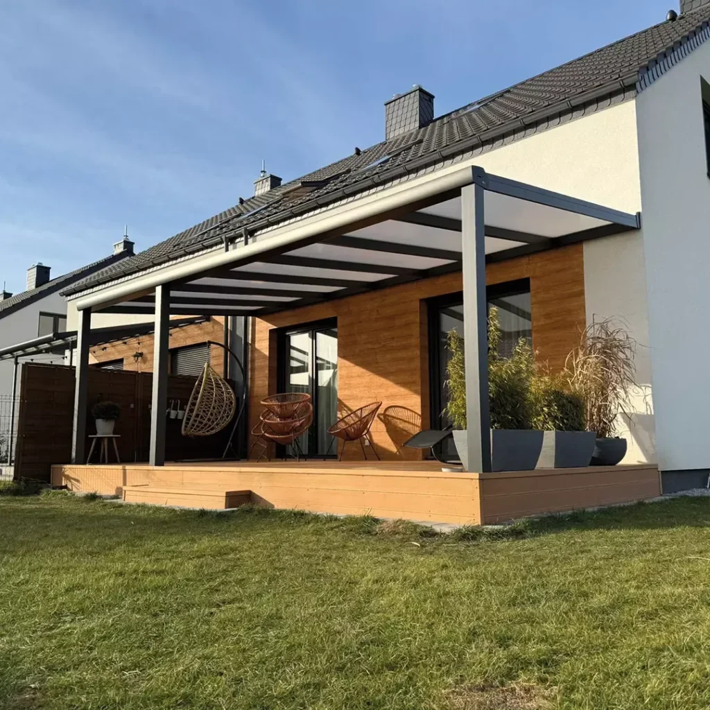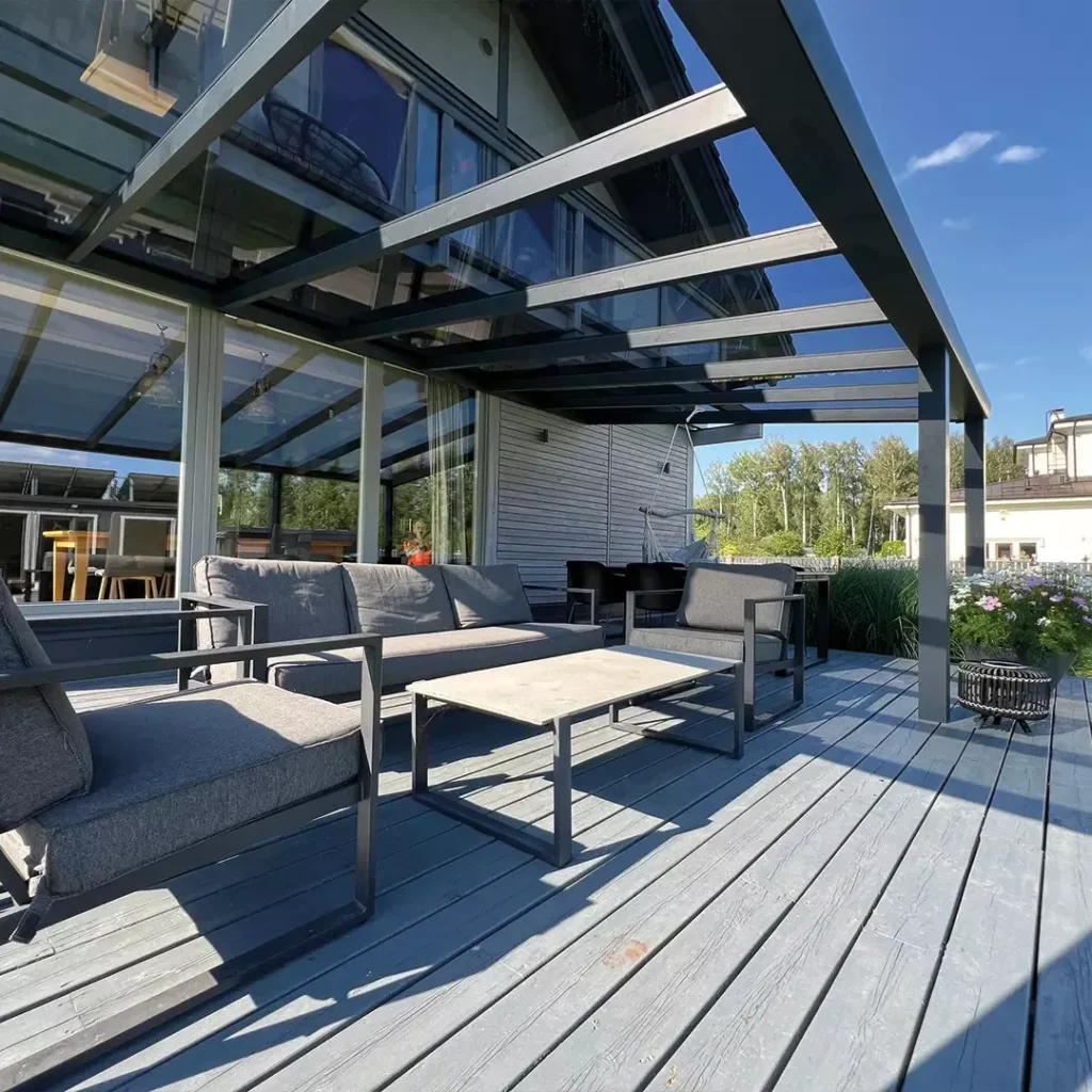Kış bahçesi sisteminin yan taşıyıcı kirişleri ile çatı malzemesi kapama profilleri aynı eksende birleşir. Herhangi bir kot farkı bulunmaz. Dışarıdan bakıldığında, iki malzeme nasıl birleşmiş anlamazsınız.